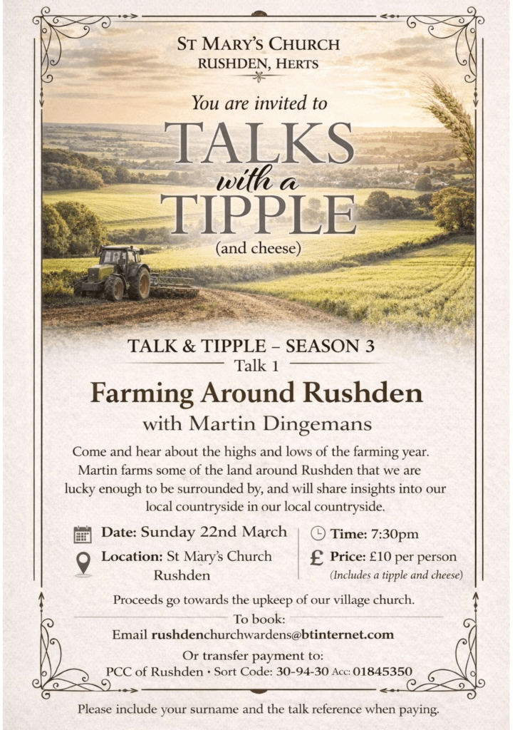 A series of fascinating talks monthly in Rushden £10 a ticket includes cheese and wine or a soft drink